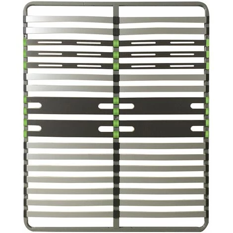 Sommier : Un sommier possédant 2 zones différenciées, pour un confort optimal. Zone du bassin renforcée pour un meilleur soutien. Zone d’épaule assouplie pour limiter les pressions. Il est composé de 2×14 lattes en bouleau multiplis largeur 53 mm , épaisseur 8 mm, et 2×2 lattes larges en bouleau multiplis largeur 151 mm , épaisseur 8 mm. Structure tube métal carré, laqué epoxy coloris gris. Coins arrondis.