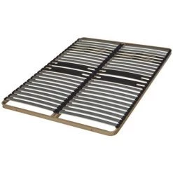 Structure: Cadre métal cintré en tube rectangulaire de 40 x 27 x 2 mm, lattes multiplis bois largeur 50 mm épaisseur 8 mm dont 3 lattes spéciales « creux d’épaule », 2 lattes spéciales « zone lombaire » largeur 125 mm épaisseur 8 mm, embouts polypropylène