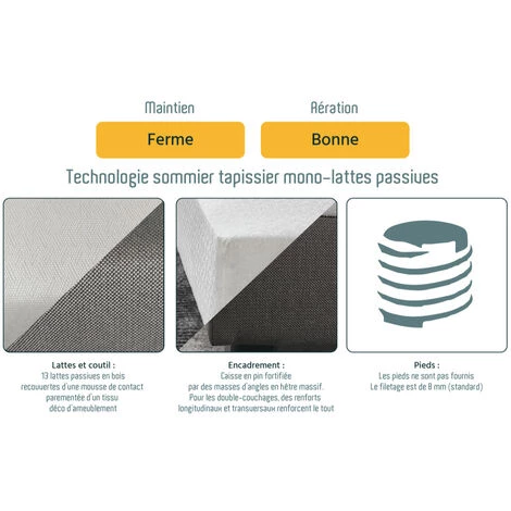 Le sommier de la gamme Capucine pour un couchage de 160×200 cm est un sommier tapissier qui allie l’élégance à la robustesse. Ce sommier à lattes passives d’une hauteur (sans les pieds) de 13 cm est composé de masses d’angles en hêtre massif avec renfort longitudinal et transversal pour les doubles couchages. Il est entouré d’un tissu décoration d’ameublementSommier pour couchage : 160 x 200 cm Intégrable dans un cadre de litRevêtement : Mousse de contact parmantée d’un tissu déco d’ameublement coloris gris anthraciteMasses d’angles en hêtre massifRenfort longitudinal et transversal pour les doubles couchages.Structure : bois en pin massifBois certifié PEFC et tissu d’ameublement certifié STANDARD 100 by OEKO‐TEX® n°1012045. Pieds : non inclusEpaisseur du sommier : 13 cmSommier à lattes : 13 lattes passivesGarantie 5 ansFabriqué en FranceNous ne livrons pas en Corse.