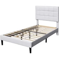 Lit + Sommier + Tête de Lit Capitonnee + 6 Pieds en 16 cm Couleur BLANCCaracteristiques:1 Lit simple solide en bois, avec des lignes epurees, ce lit sera un ajout apprecie aux chambres et au salon, egalement ideal pour les petits espaces, les enfants, les adolescent, les invites et les adultes.2 Un sommier solide avec 13 resistantes et confortables Lattes en bois 5 cm de large et 0,9 cm d’epaisseur + Pieds Hauts en 16 cm3 Resistant aux chocs et aux rayures epaisseur du Metal +/- 1,2 mm . Tissu PVC Simili etanche tres facile d’entretien 4 Livraison rapide5 Hauteur de la Tête de Lit Capitonnee 124 cm , Hauteur des longs pans 14 cm et Epaisseur 3 cmS’il vous plait noter:* Le matelas n’est pas inclus.* Ne serrez pas les vis jusqu’a ce qu’elles soient completement assemblees.* Ne Pas utiliser ce produit si des pieces sont manquantes, endommagees ou usees.* Ne Pas permettre aux enfants de sauter sur le lit, car cela pourrait causer des dommages au chassis.* Veuillez verifier et serrer toutes les vis et boulons vers le haut tous les 3 mois pour assurer la stabilite.